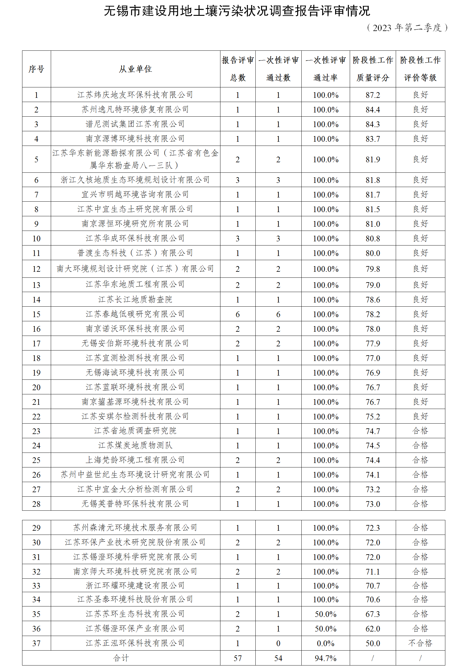 根據(jù)《無錫市建設(shè)用地土壤污染狀況調(diào)查從業(yè)單位工作質(zhì)量評價辦法(試行)》,我局對全市2023年第二季度建設(shè)用地土壤污染狀況調(diào)查報告評審情況進行了匯總,相關(guān)情況公示如下: