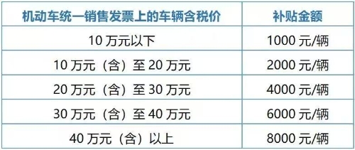 審核通過后,按機動車銷售統(tǒng)一發(fā)票上的購車價格(含稅價),分別給予一次性補貼。