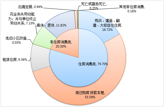 2025年三季度,住房消費(fèi)類提取金額為53.51億元,環(huán)比下降2.16%,占當(dāng)季提取額的79.7%。其中還貸提取占比最高,提取金額35.98億元,占當(dāng)季提取額的53.59%。具體提取結(jié)構(gòu)如下: