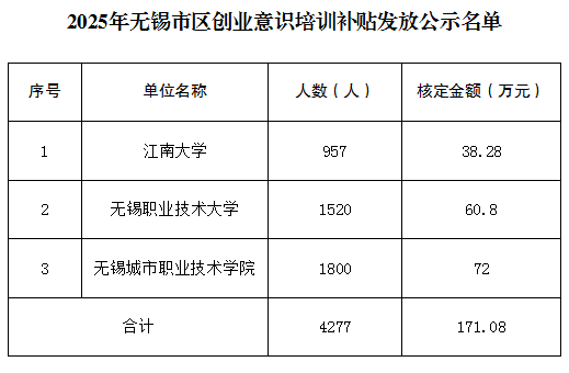 | 內(nèi)容概述 | 根據(jù)《關(guān)于鼓勵(lì)在錫大中專(zhuān)院校開(kāi)展大學(xué)生創(chuàng)業(yè)意識(shí)培訓(xùn)的通知》(錫人社發(fā)〔2020〕73號(hào))《關(guān)于發(fā)布2025年無(wú)錫市政府補(bǔ)貼性職業(yè)技能培訓(xùn)項(xiàng)目等指導(dǎo)目錄的通知》(錫人社函〔2025〕35號(hào))文件精神,現(xiàn)將2025年創(chuàng)業(yè)意識(shí)培訓(xùn)補(bǔ)貼審核情況公示如下,公示期自即日起7天,如有異議,請(qǐng)及時(shí)以書(shū)面或口頭形式向無(wú)錫市勞動(dòng)就業(yè)管理中心反映,聯(lián)系電話(huà):0510-82829088。 | ||||