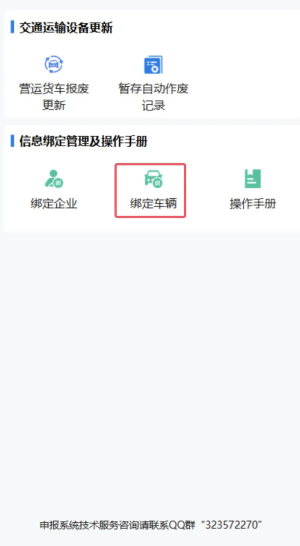 3.點(diǎn)擊“交通運(yùn)輸設(shè)備更新”,綁定企業(yè)和車輛
