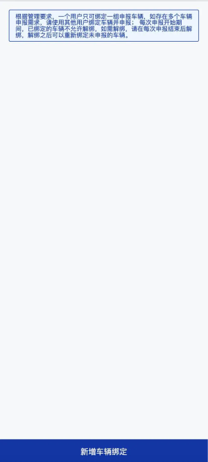 特別提醒:綁定之后,需要選擇申報(bào)類型并綁定車輛,一個(gè)綁定用戶只可綁定一次申報(bào)車輛,如存在多個(gè)車輛申報(bào)需求,請(qǐng)使用其他用戶綁定車輛并申報(bào)。每次申報(bào)開始期間,已綁定的車輛不允許解綁,如需解綁,請(qǐng)?jiān)诿看紊陥?bào)結(jié)束后解綁,解綁 之后可以重新綁定未申報(bào)車輛。(注:申報(bào)期間也不能更改申報(bào)類型和更換綁定車輛)。