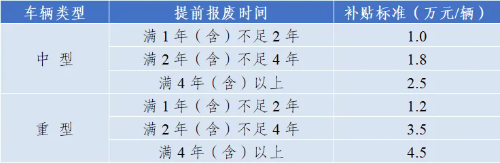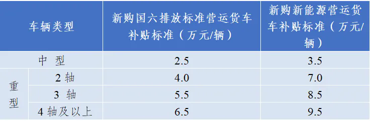 3.對(duì)距離強(qiáng)制報(bào)廢年限不滿一年的國(guó)四及以下排放標(biāo)準(zhǔn)營(yíng)運(yùn)貨車實(shí)施報(bào)廢,并新購(gòu)中重型國(guó)六排放標(biāo)準(zhǔn)貨車或新能源貨車的,按照新購(gòu)補(bǔ)貼標(biāo)準(zhǔn)予以補(bǔ)貼;對(duì)掛車不予補(bǔ)貼。