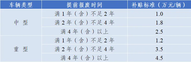 今年老舊營(yíng)運(yùn)貨車報(bào)廢更新的補(bǔ)貼標(biāo)準(zhǔn)與去年基本保持一致,按照?qǐng)?bào)廢車輛類型、提前報(bào)廢時(shí)間和新購(gòu)置車輛動(dòng)力類型等,實(shí)施差別化補(bǔ)貼,具體如下: