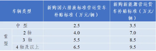 (2)新購(gòu)置車輛應(yīng)當(dāng)為注冊(cè)登記的國(guó)六排放標(biāo)準(zhǔn)(含柴油、汽油、天然氣等動(dòng)力類型貨車)或新能源車輛,并持有交通運(yùn)輸主管部門發(fā)放的有效《道路運(yùn)輸證》。其中,新能源車輛應(yīng)納入《減免車輛購(gòu)置稅的新能源汽車車型目錄》;
