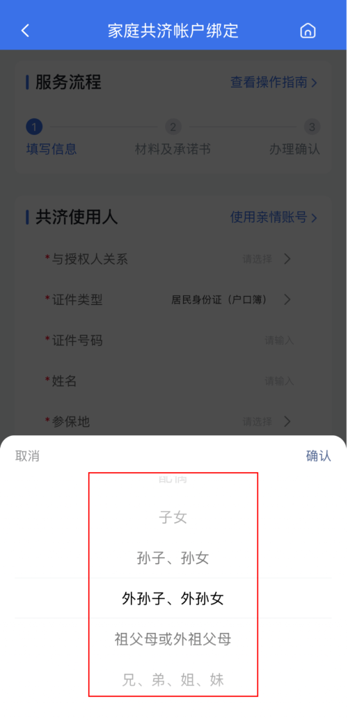 2. 填寫(xiě)家庭成員信息,確認(rèn)近親屬關(guān)系